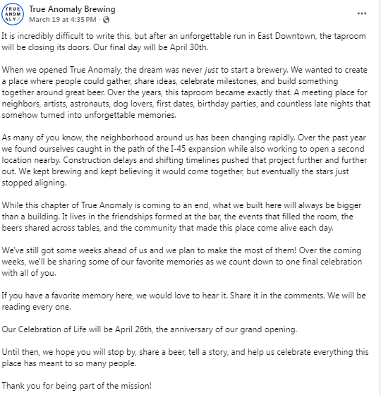 Care to share a memory about True Anomaly Brewing and wish them farewell, send us an email! We would love to share here! Cheers@houstonbeerguide.com.